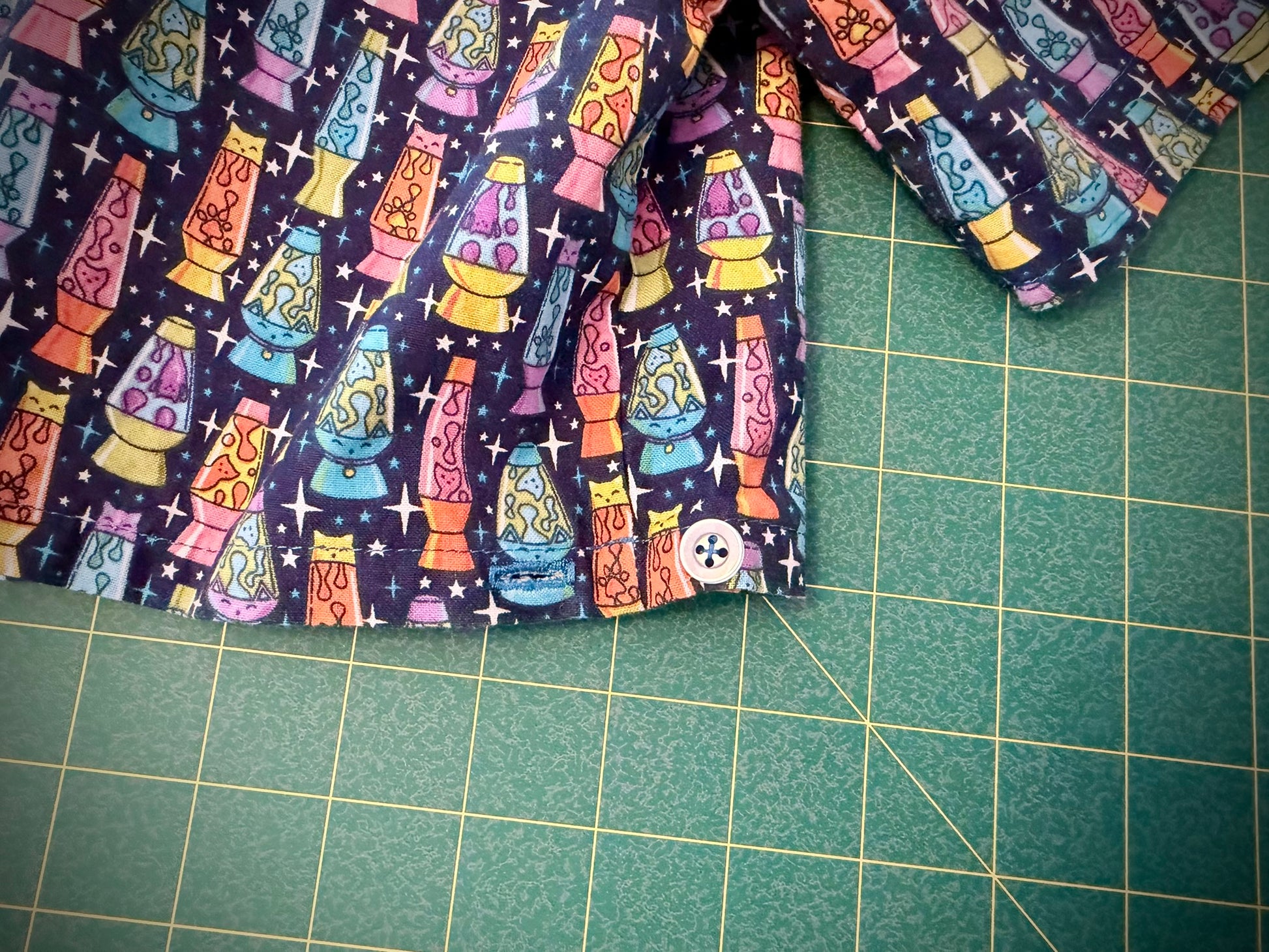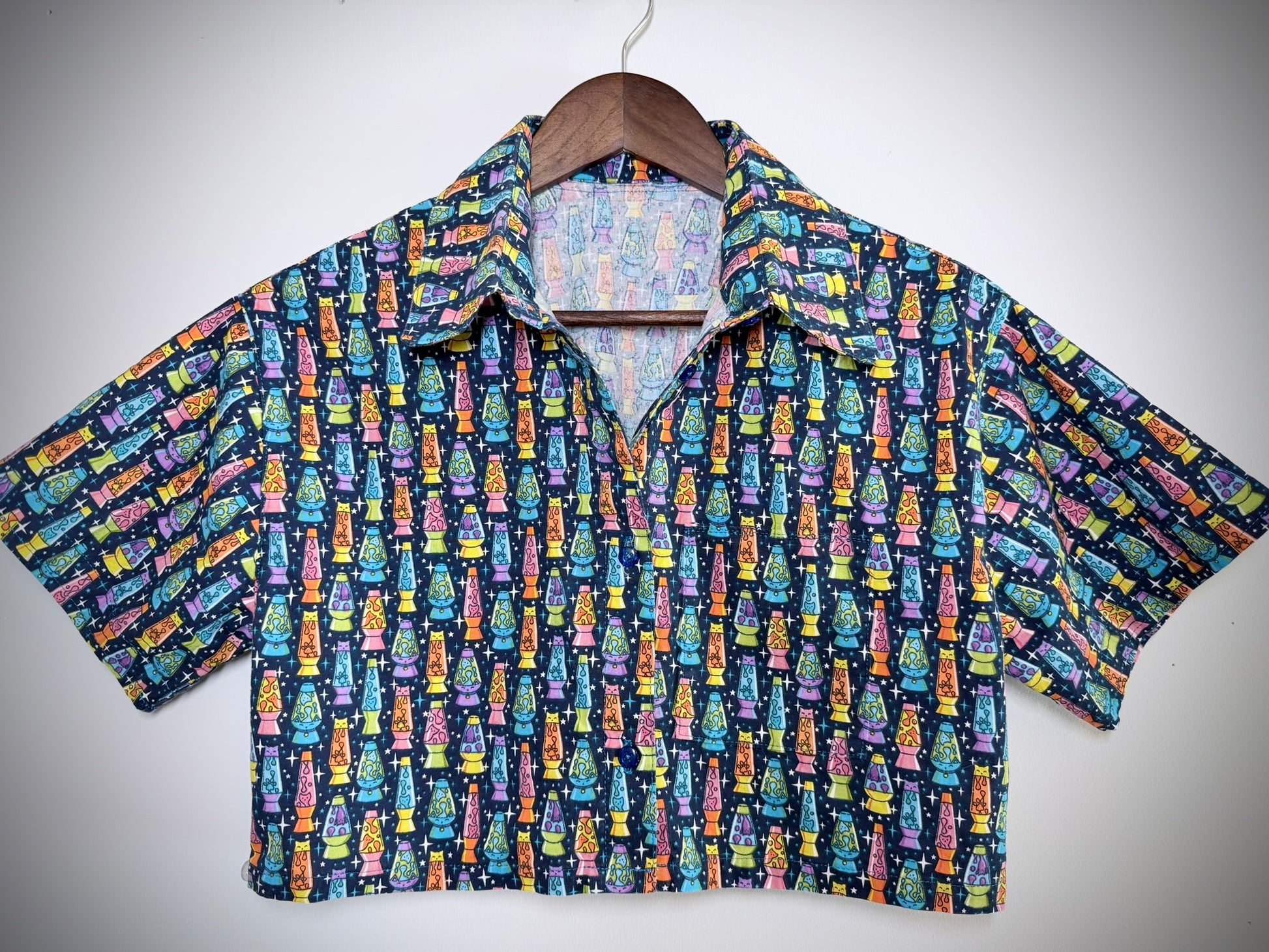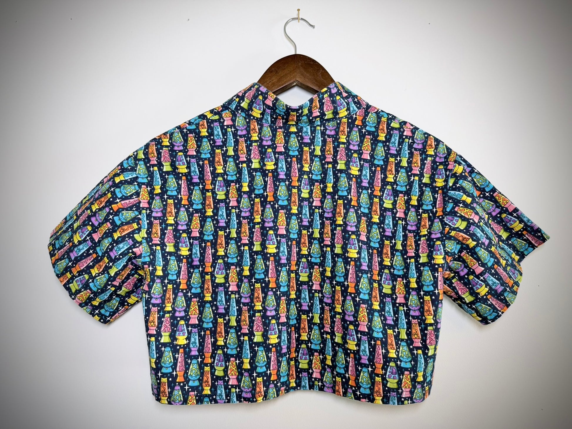 The Cosmic Lava Cat Studio Button-Up is made from a 100% cotton, vibrant lava lamp print on a deep navy background, scattered with tiny star details for a cosmic feel. Hidden within the lava lamps are small cat illustrations, adding a fun, unexpected detail that reveals itself up close. Finished with dark blue translucent buttons and matching dark blue thread, the details stay cohesive and intentional while letting the print stand out. This shirt features an adjustable side detail at each seam, with a discreet button and buttonhole that allow the waist to be pulled in by about 2 inches for a closer, more body-tracing fit. Wear it unfastened for a straight, relaxed shape.