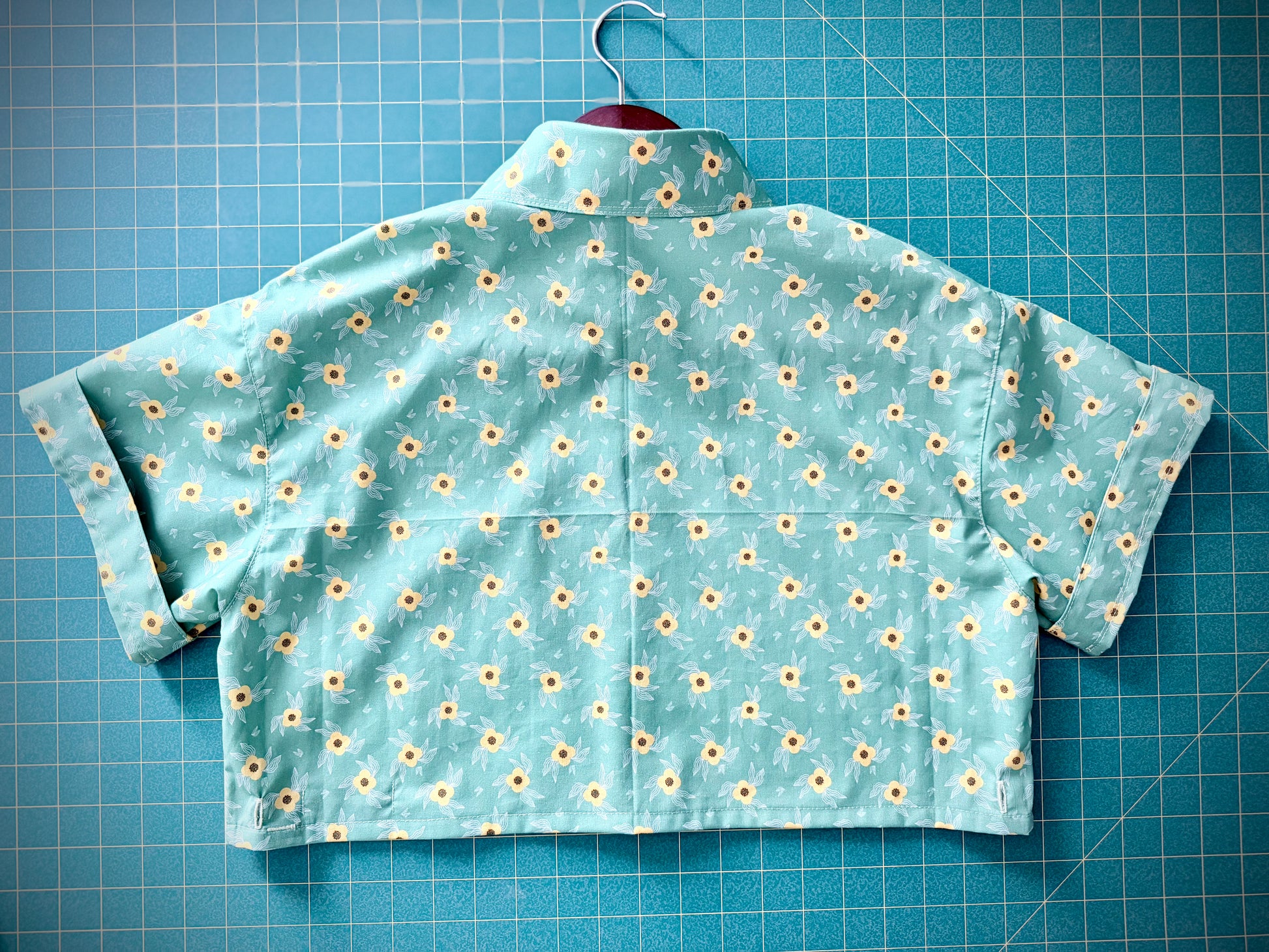 The Sunroom Studio Button-Up is handmade from 100% cotton in a deep mint green tone with small yellow flowers equally patterned throughout. Finished with pastel green buttons and reinforced seams stitched in pastel green thread, the details of this piece are meant to be bright and subtle. This shirt features an adjustable side detail at each seam, with a discreet button and buttonhole that allow the waist to be pulled in by about 2 inches for a closer, more body-tracing fit. Wear it unfastened for a straight, relaxed shape. The large sleeve hems help create a beautiful rolled sleeve option.